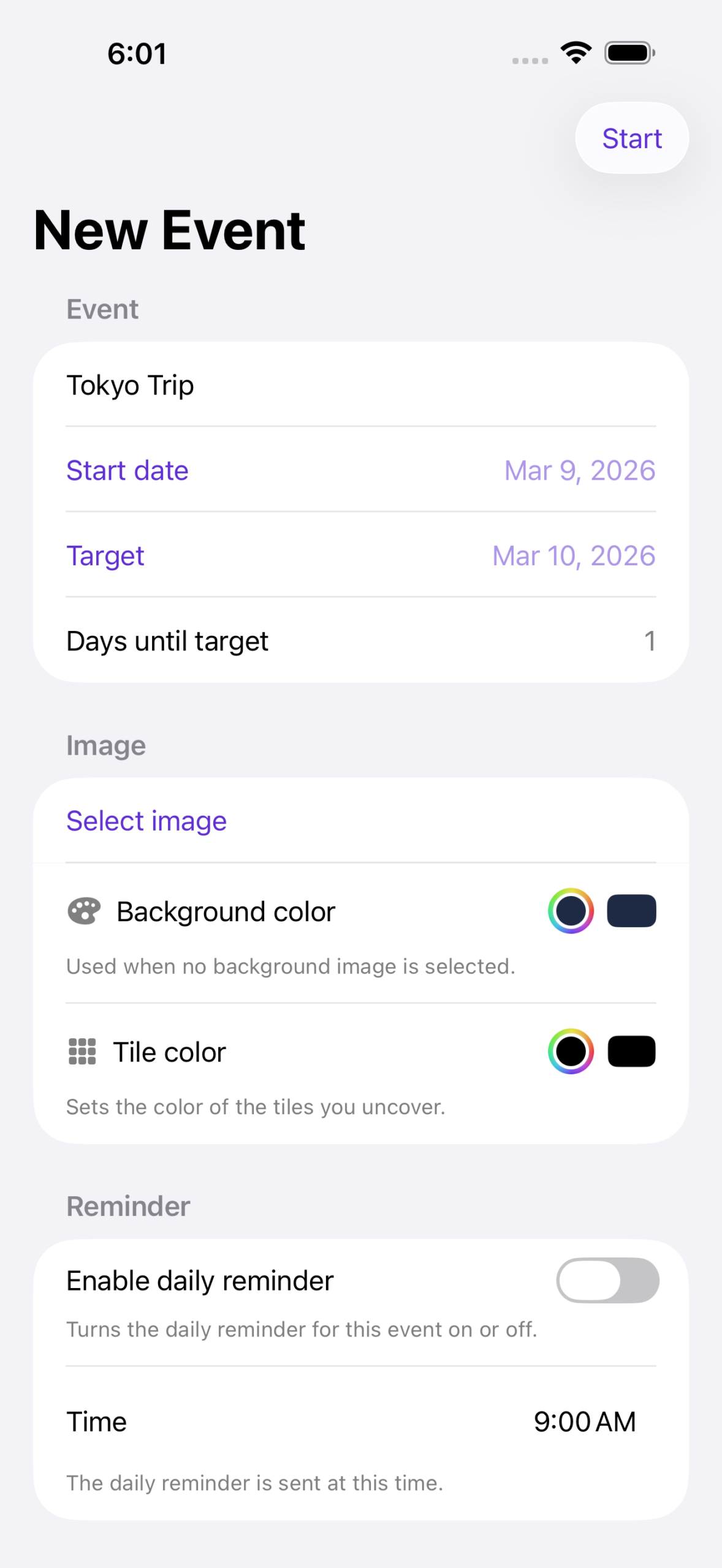 Du wählst ein Datum aus, gibst dem Ganzen einen Namen und suchst ein Bild, das für genau dieses Ereignis steht. Und ab diesem Moment passiert jeden Tag etwas Kleines: Ein weiteres Stück dieses Bildes wird sichtbar.