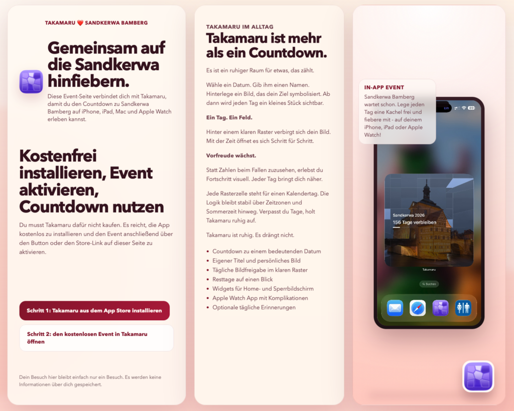Takamaru ist nicht einfach nur ein Countdown. Es ist eher so ein ruhiger, kleiner Raum, in dem man sich Schritt für Schritt auf etwas zubewegt, das einem wirklich wichtig ist.